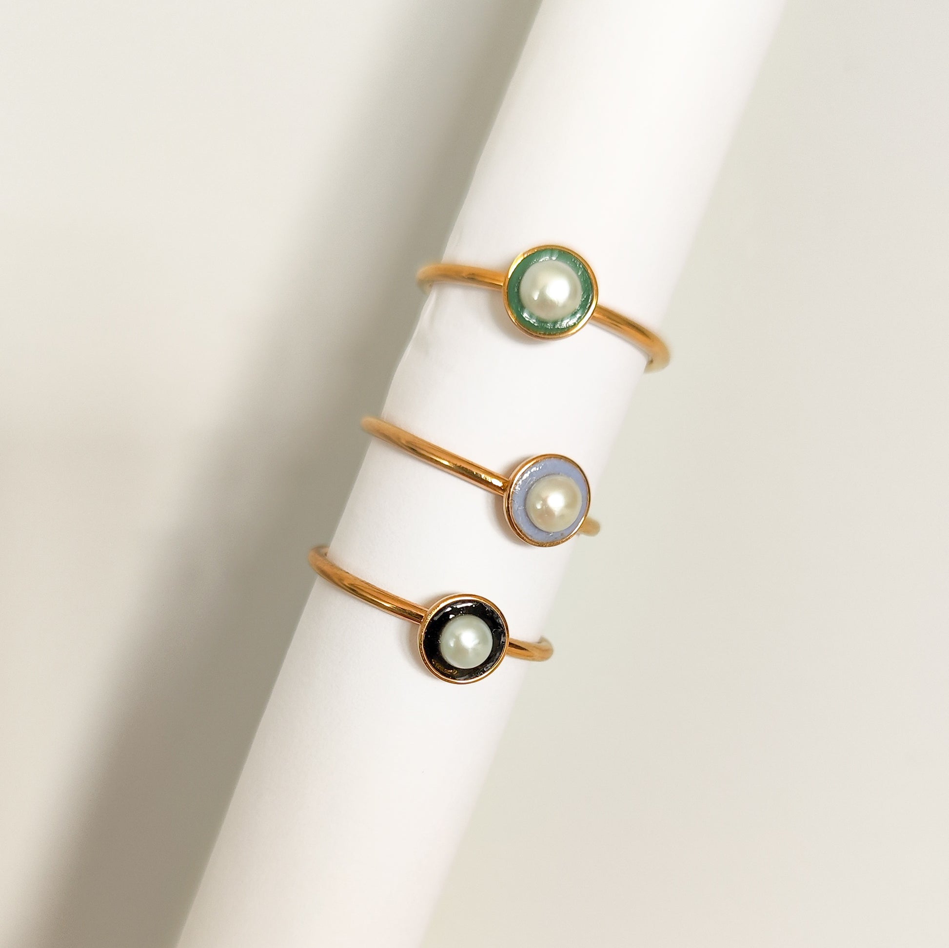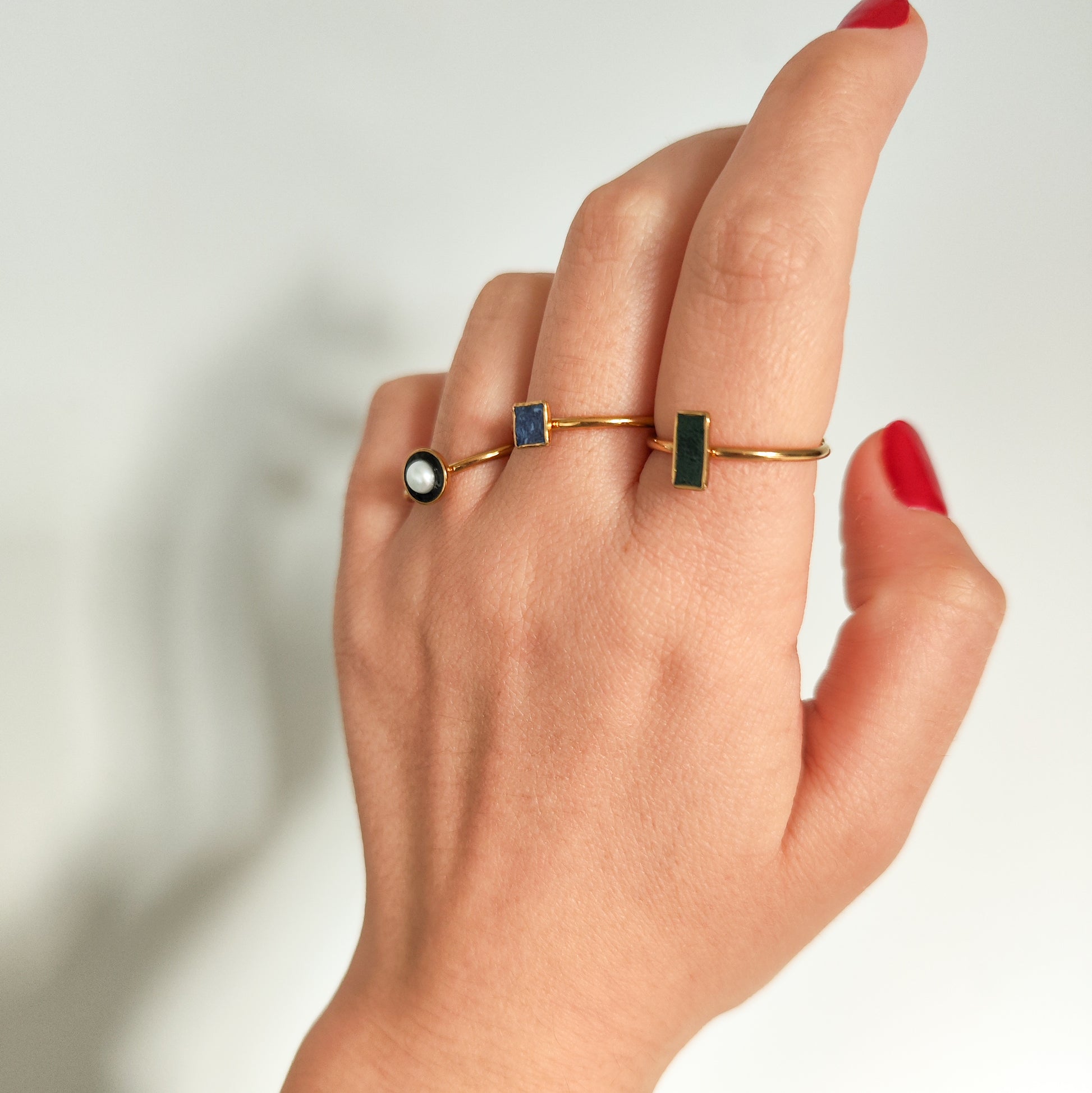 Este diseño de anillos ha sido compuesto por una pieza de una base de acero inoxidable y acabado en una pieza de arcilla polimérica moldeada a mano, por lo que cada pieza es única. Son anillos ajustables por lo que se ajustan a cualquier talla de anillo.